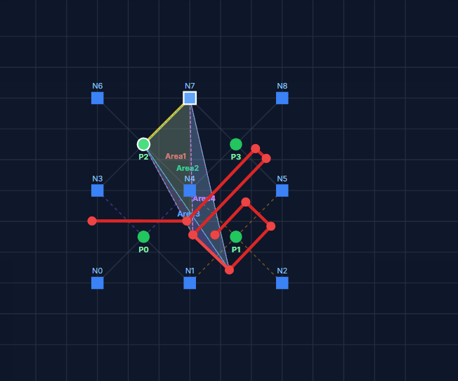 A line-crossing algorithm in 2D based on signed areas of certain triangles solved the problem of nodes on cracks. For any three points, x1, x2, and x3, the signed area of the triangle with those vertexes is given by
